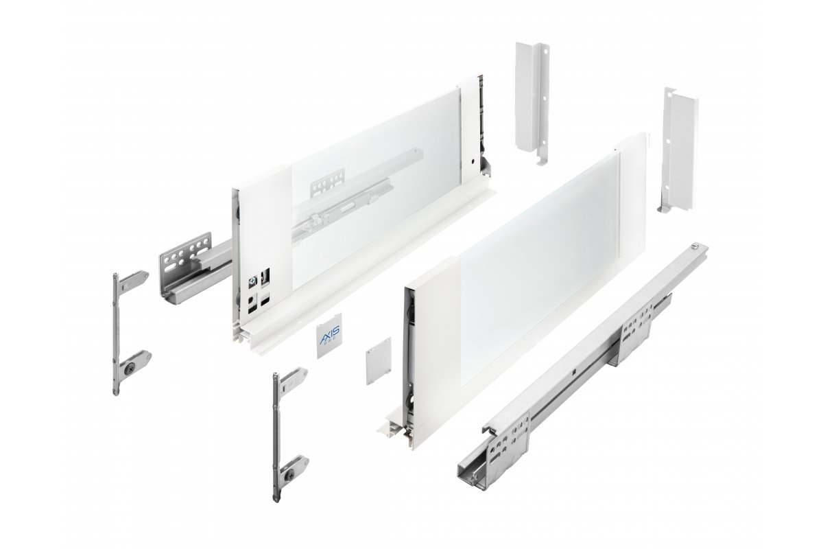 Ящик AXIS PRO со стеклянными боковинами характеризуется долговечностью механизмов, подтверждённой сертификатами испытаний на 60 000 циклов. Обеспечивает полное выдвижение в длинах от 300 до 550 мм, механизм плавного закрывания обеспечивает бесшумную работу и плавное закрывание ящика. Доступны в трех вариантах высоты, что позволяет адаптировать их к вашим индивидуальным потребностям. Стеклянные боковины ящиков AXIS PRO изготовлены из закаленного стекла, устойчивы к повреждениям и легко очищается. Ширина ящика составляет 14 мм, что позволяет максимально использовать внутреннее пространство мебели. Полезная нагрузка ящика до 40 кг, позволяет хранить в нем различные продукту. В основу ящика AXIS PRO со стеклянным боковинами входят направляющие AXIS PRO с бесшумным закрыванием. Легкий монтаж благодаря удобной регулировке находящейся внутри ящика, регулировка наклона и горизонтальная регулировка в диапазоне +- 2 мм. В ящике можно разместить целый ряд систем организации пространства, вставок для столовых приборов, ковриков и сортировщиков мусора.